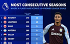 英超连续最多赛季进球数上双球员:鲁尼、兰帕德、凯恩前三