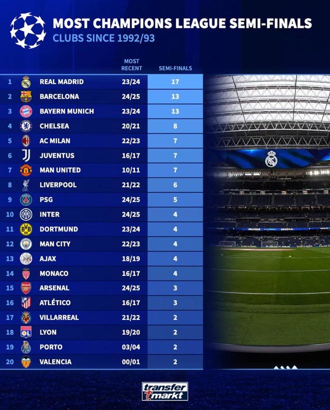 欧冠92年改制后晋级半决赛次数:皇马17次第1,巴萨、拜仁第2